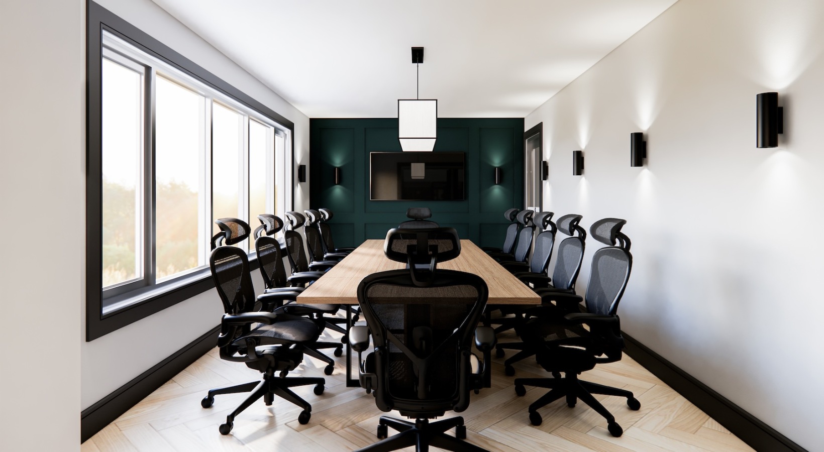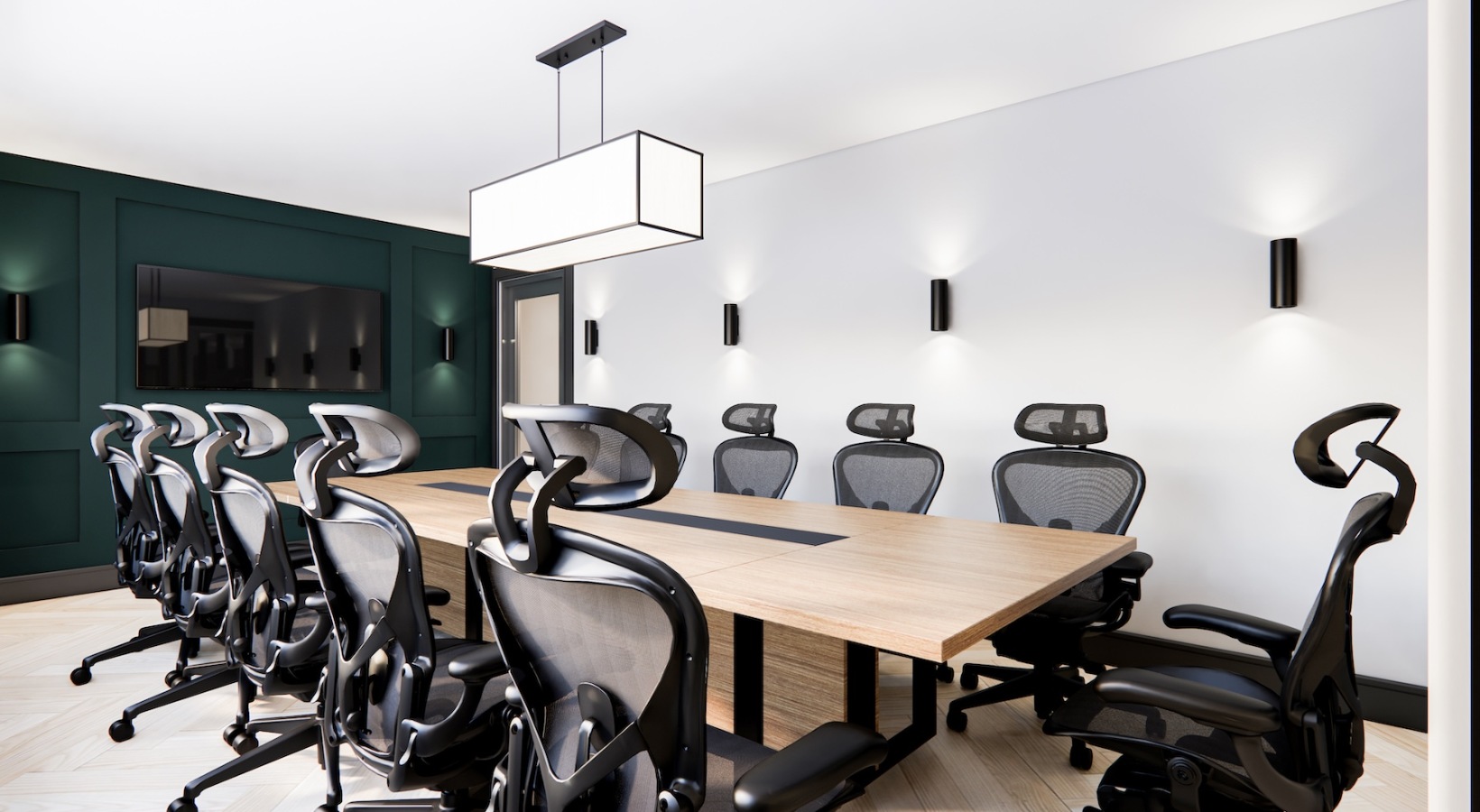 • conference room with a large rectangular table and chairs