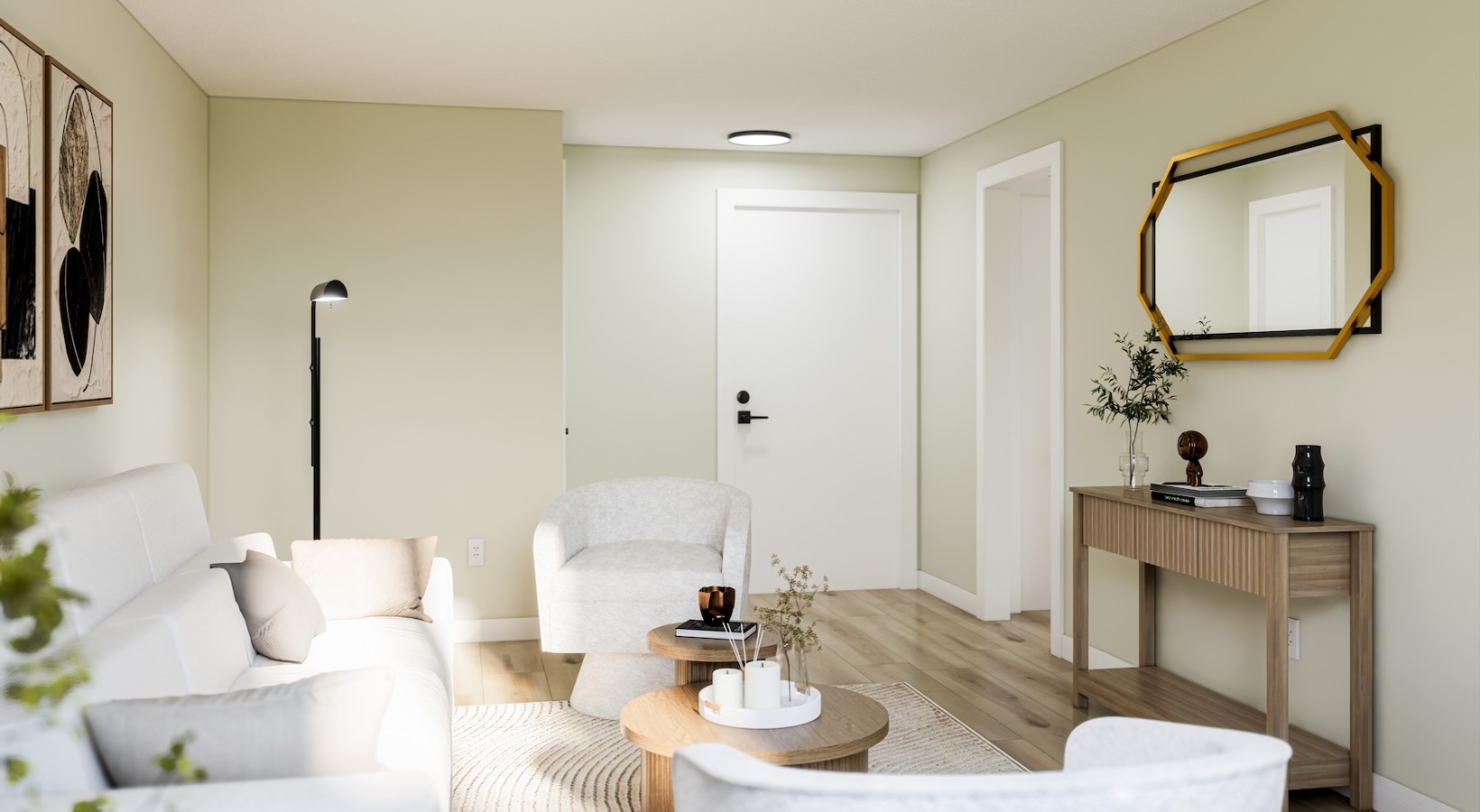 • living room with furniture table plant mirror and lamp