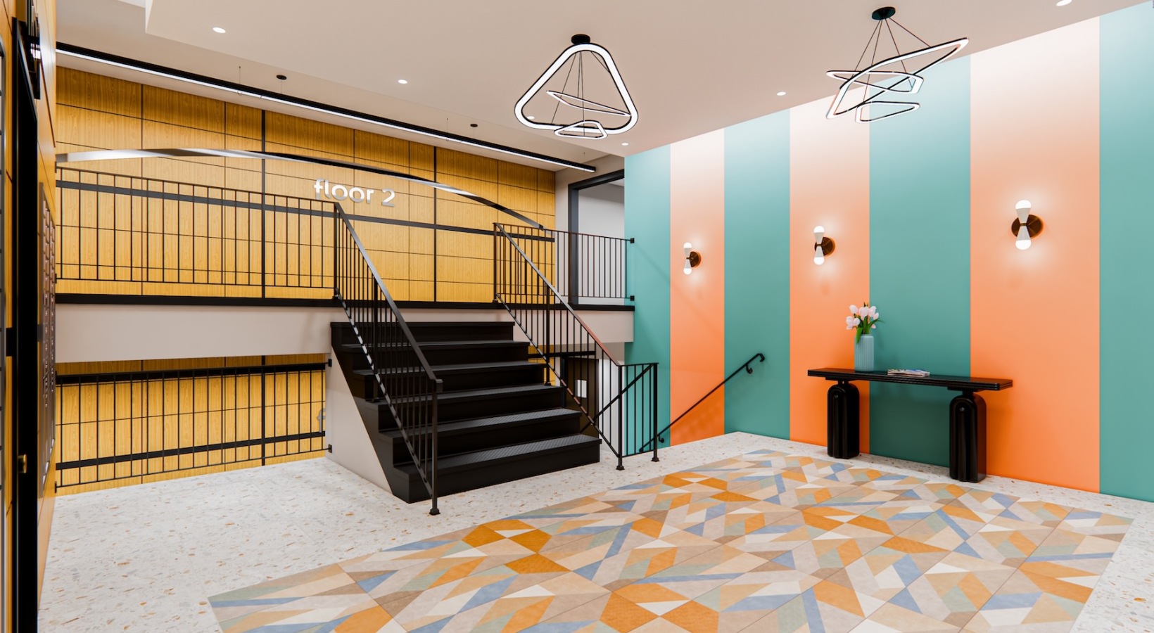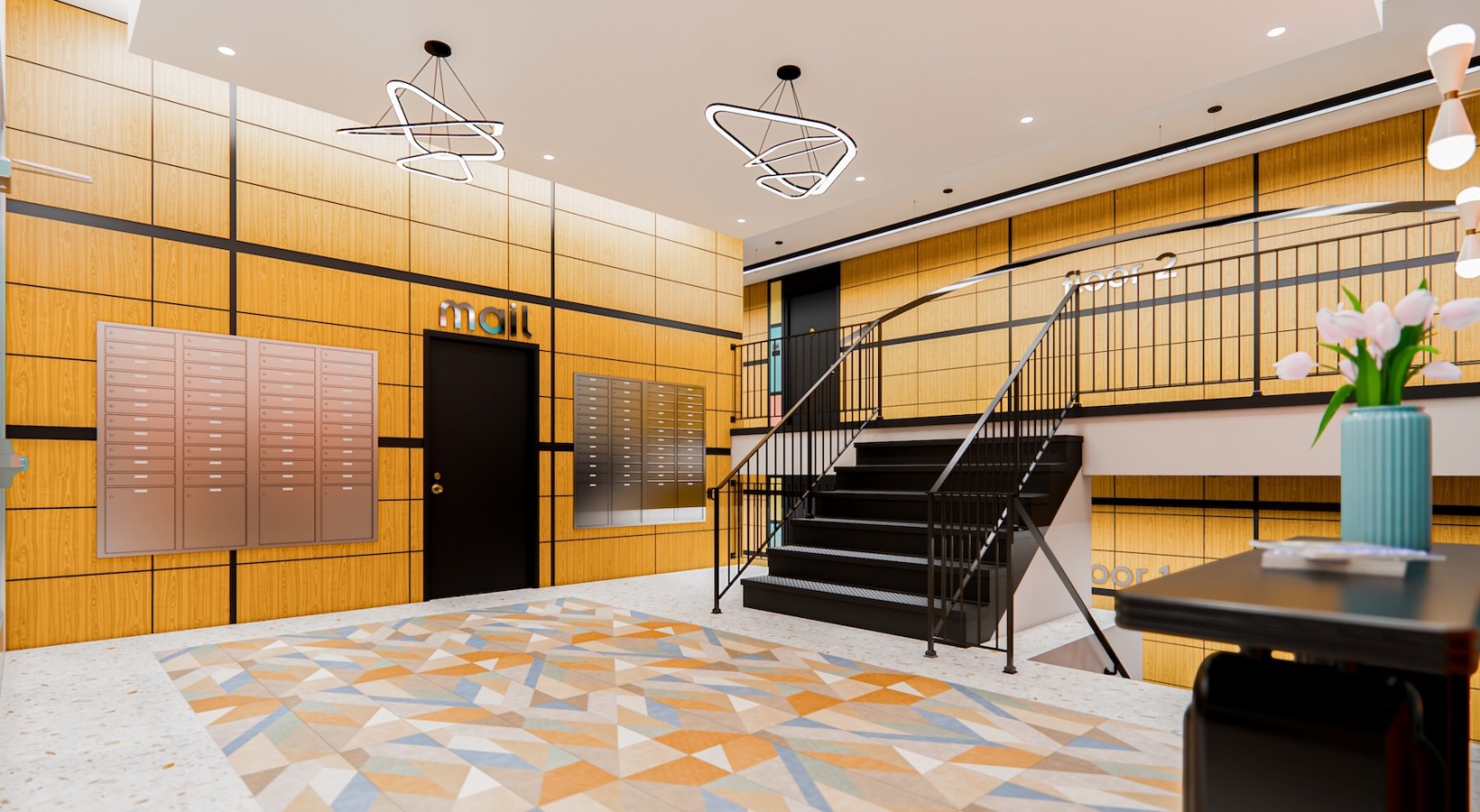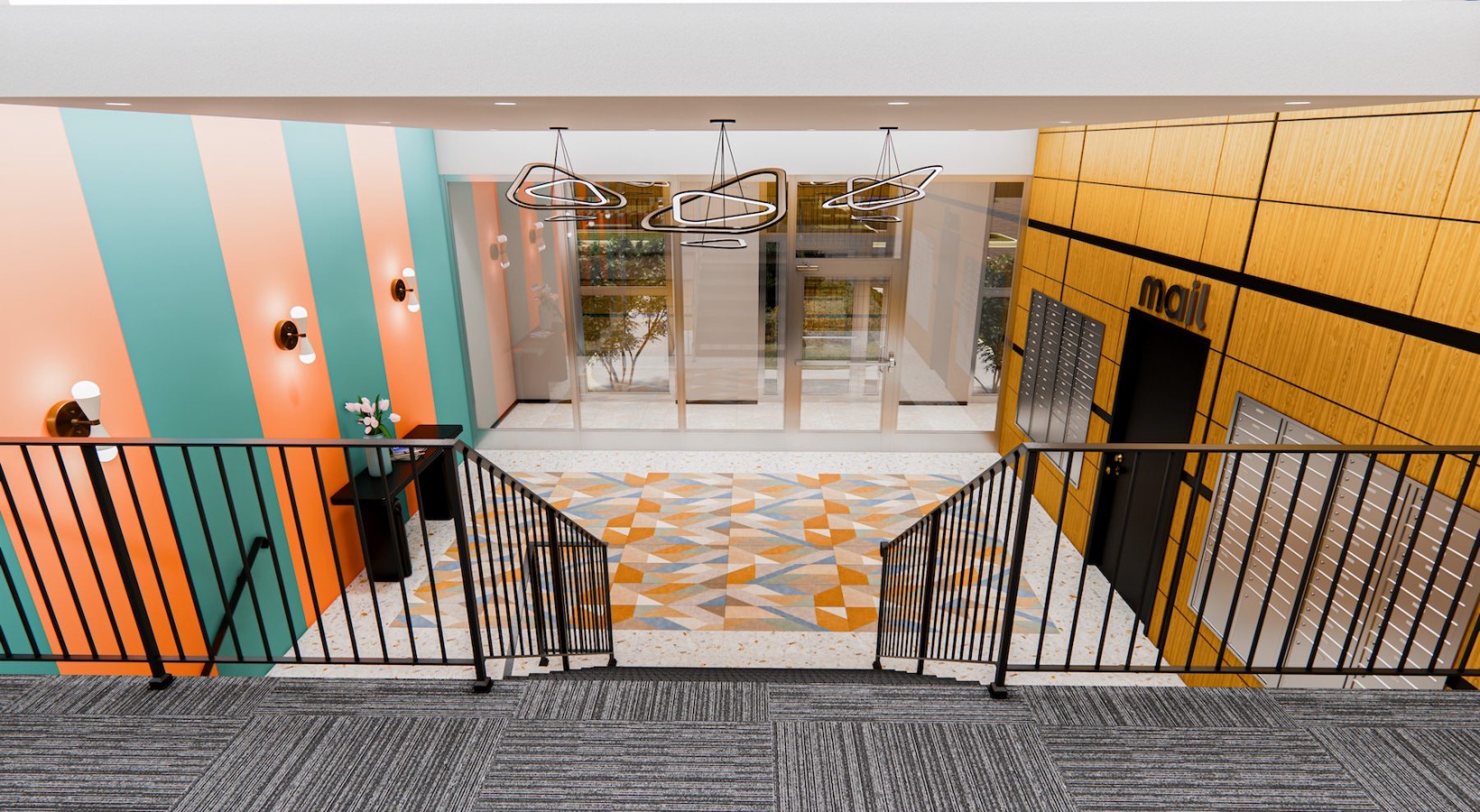 • a view into the lobby from the top of a staircase