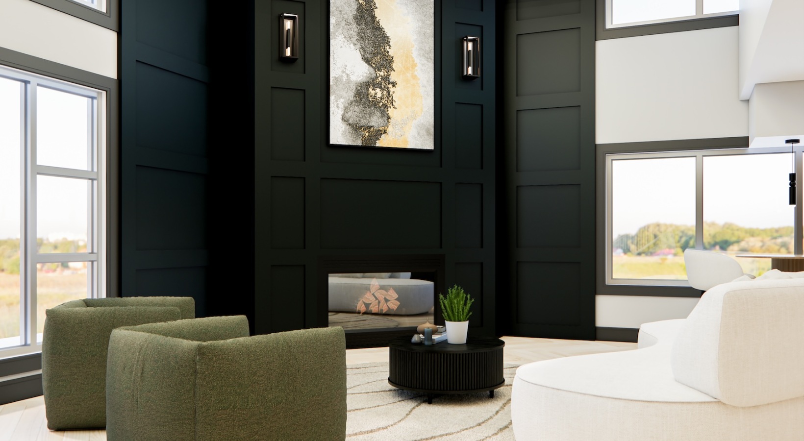• a spacious room with a fire place and large windows