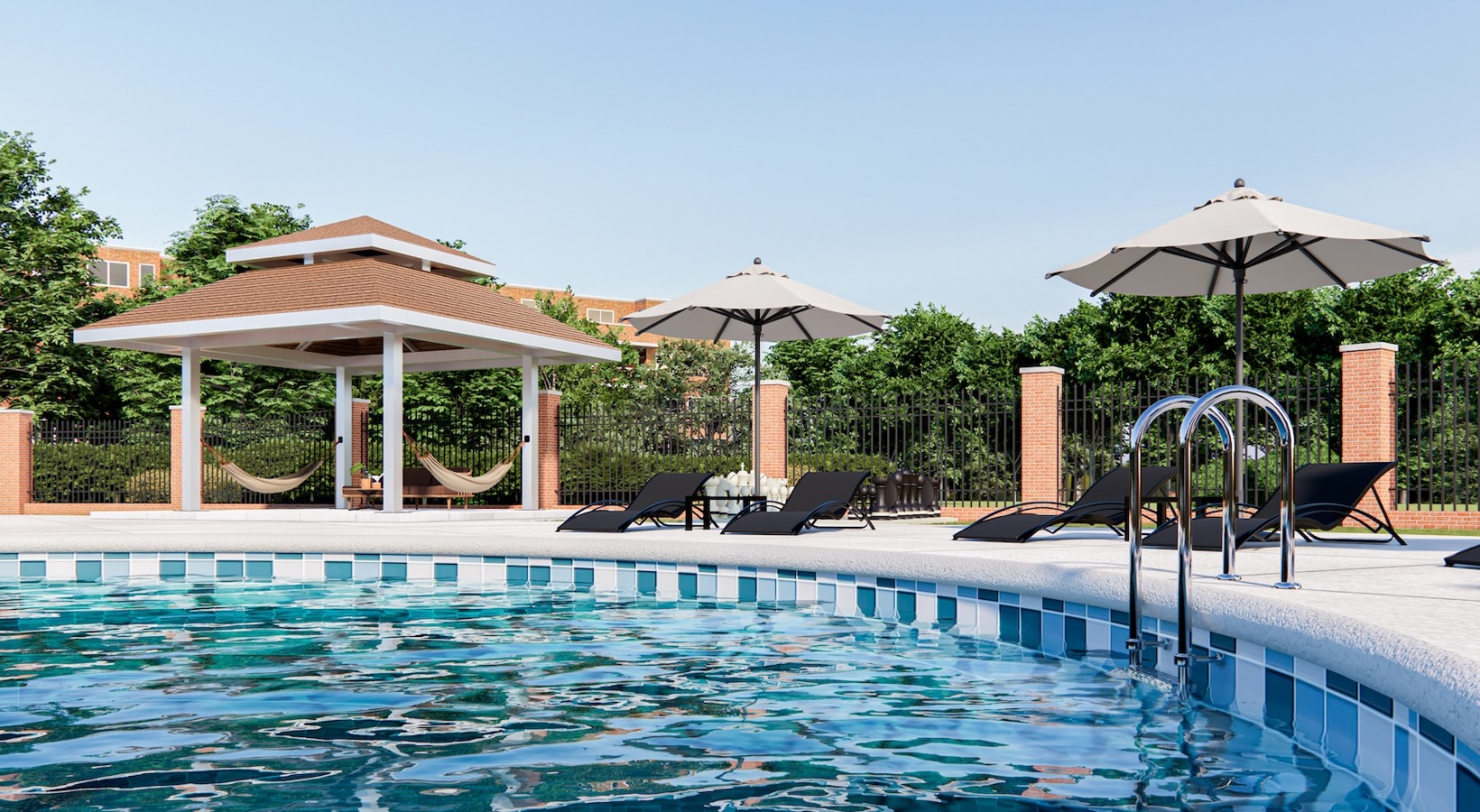 • swimming pool with a building in the background