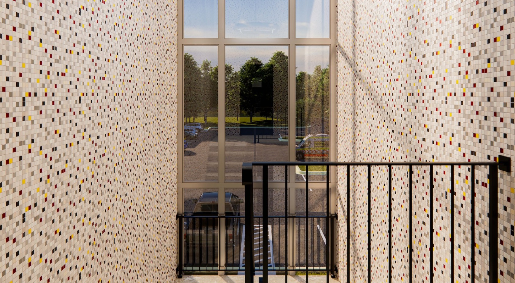 • a stairwell with a large vertical window