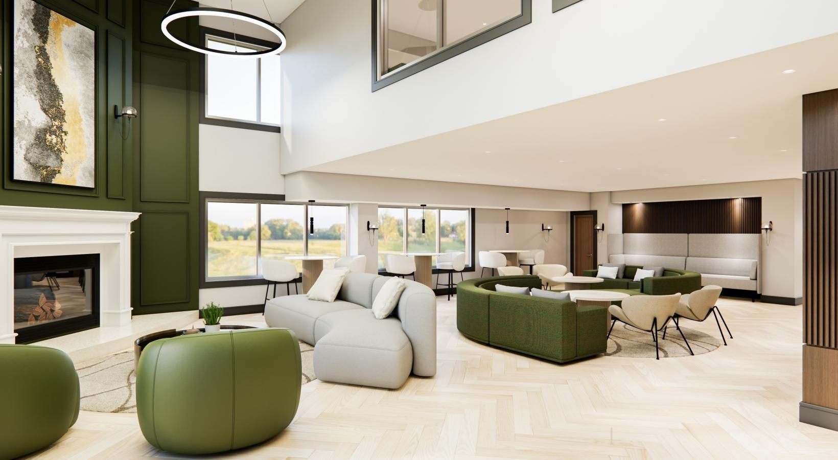 • a large room with green furniture